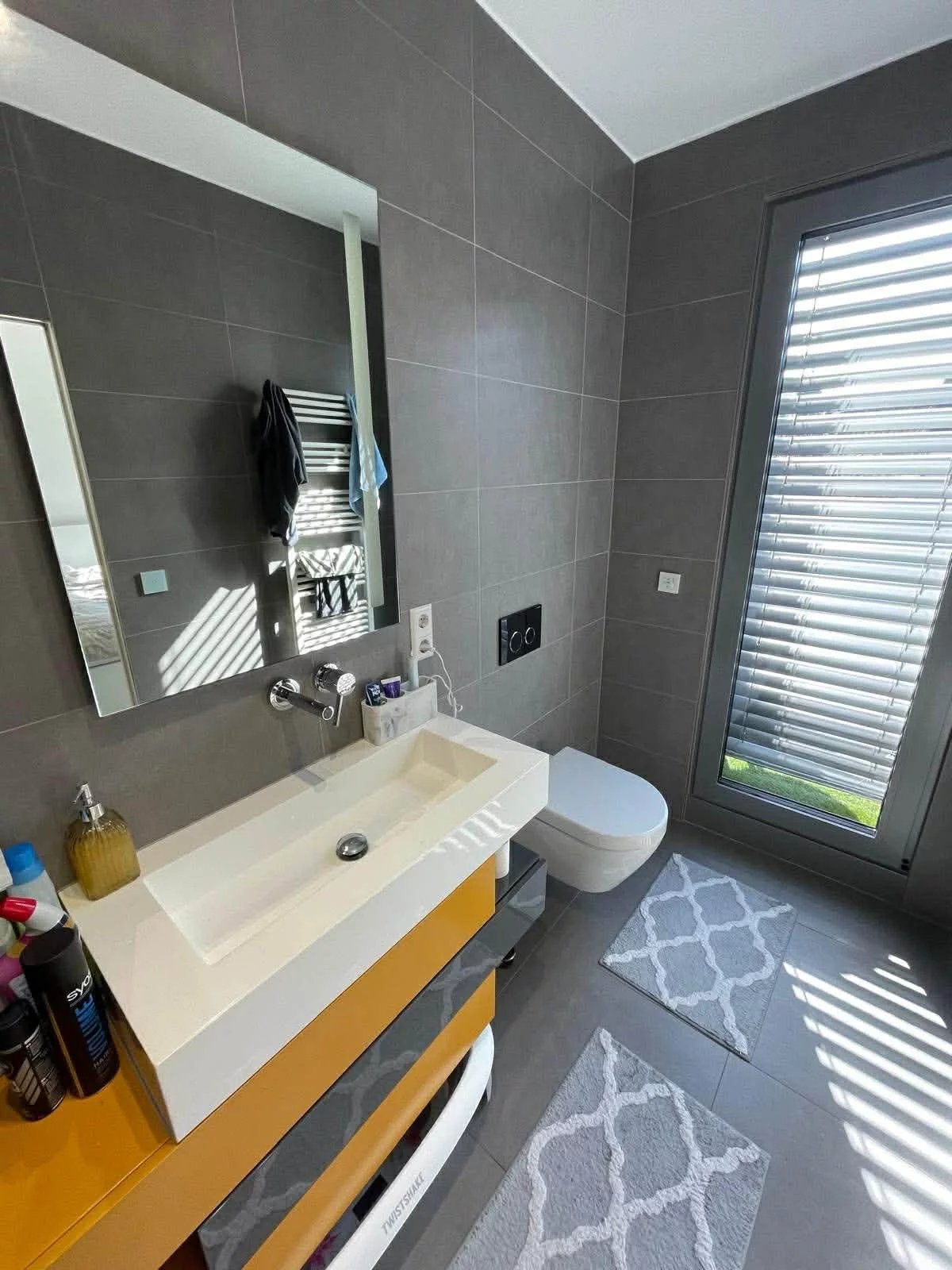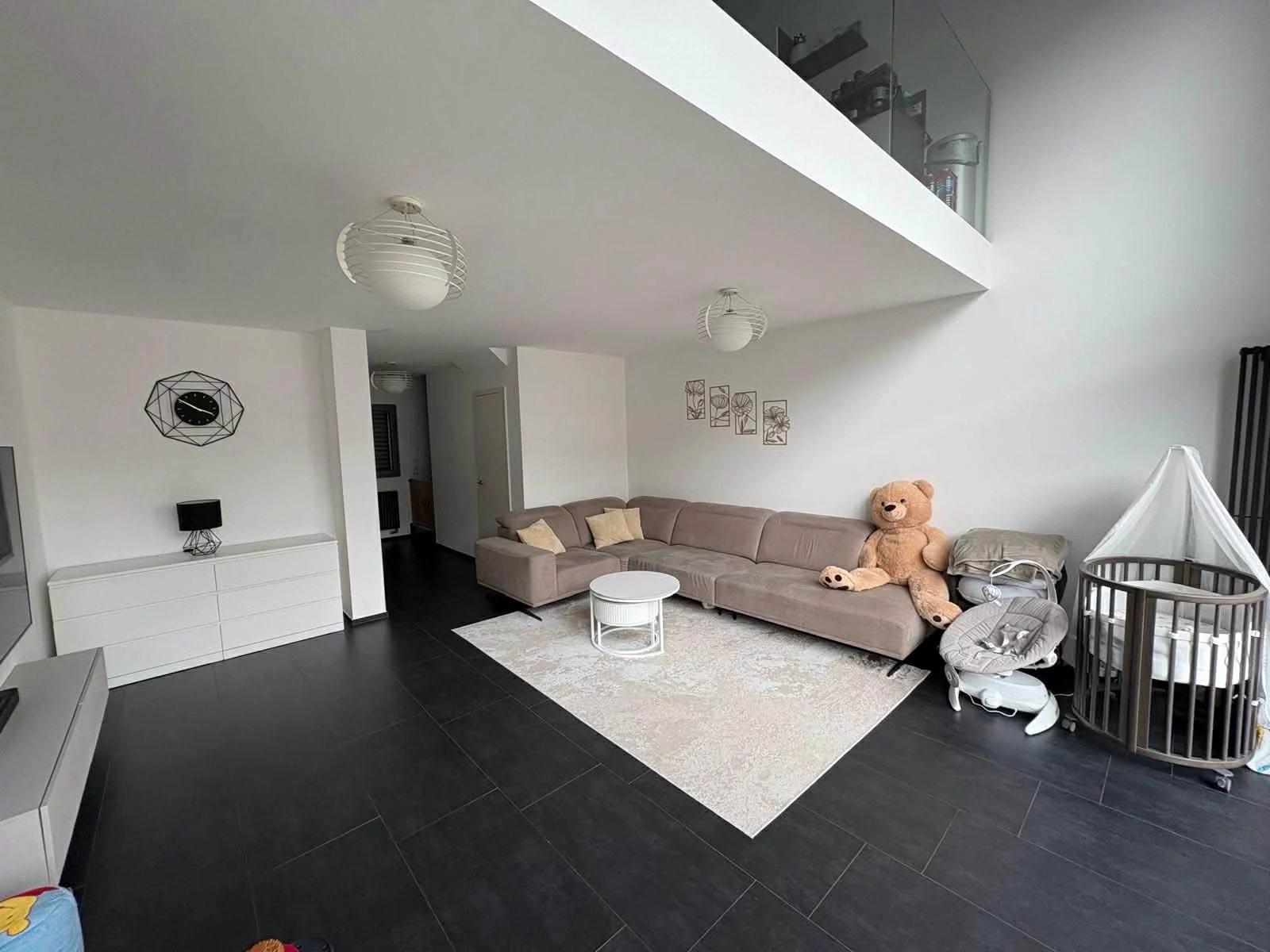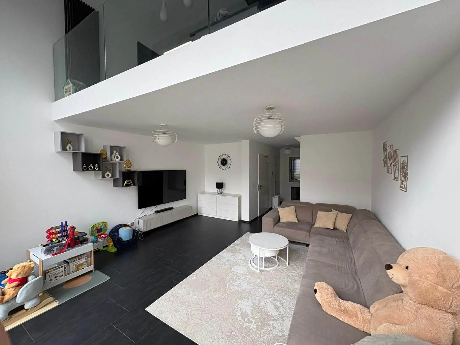 - séjour (40,73 m2) avec accès terrasse (20,28 m2) & jardin (23,12 m2) -> fenêtres d’une hauteur jusqu’à la mezzanine au 1er étage avec volets électriques